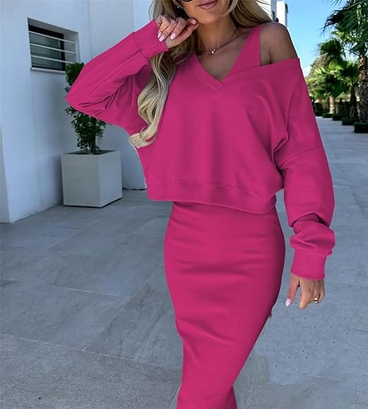 LD | Trui met losse V-hals + gebreide wikkelrok met slanke pasvorm op de heupen